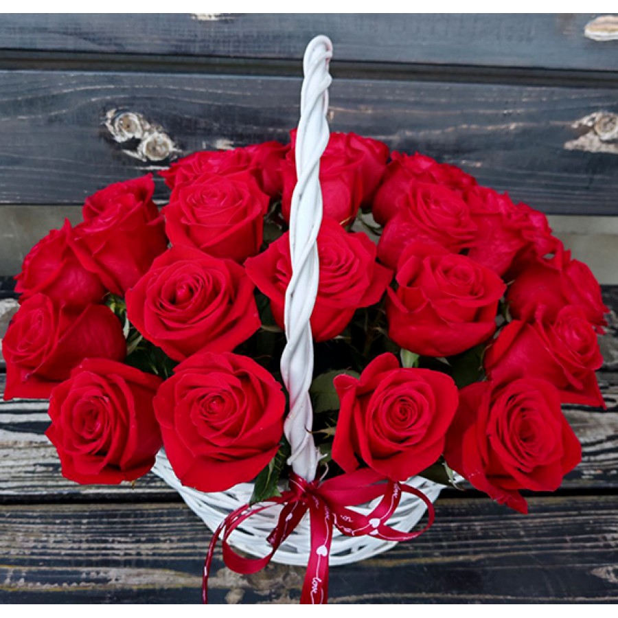 A basket of red roses is a bright symbol of passion, love and admiration. Luxurious scarlet buds in an exquisite basket look elegant and festive, turning any moment into a special event. Such a gift is suitable for a declaration of love, an anniversary, a wedding or a celebration, will emphasize the importance of the addressee and give a sea of ​​positive emotions. Fresh flowers and stylish presentation make the composition unforgettable.