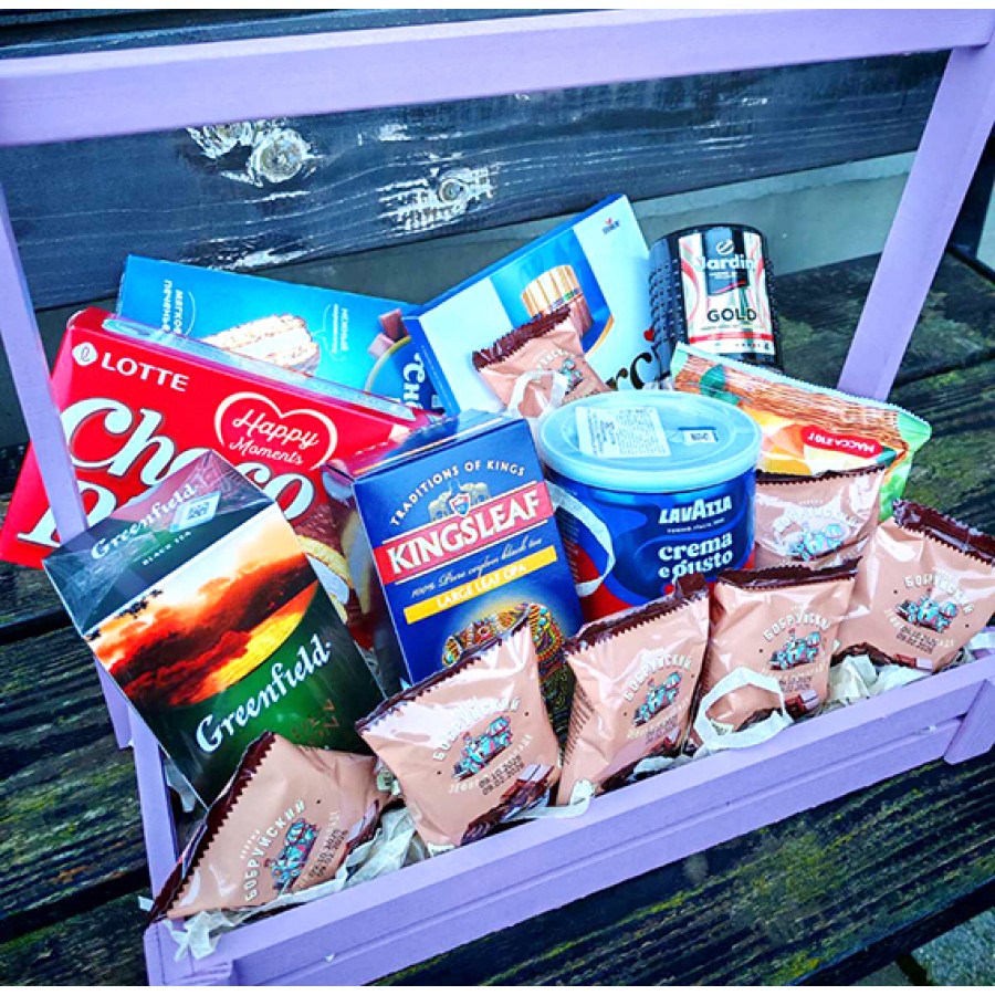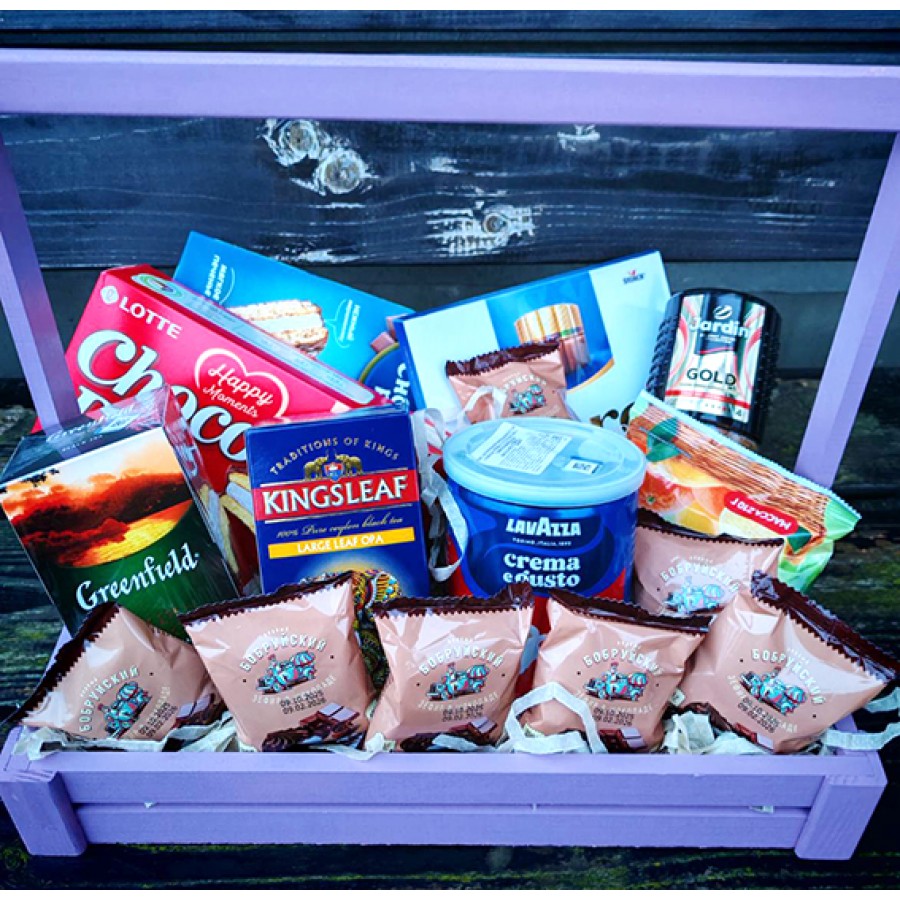 Compound: instant coffee 95 g, ground coffee in an iron can 250 g, cookies in a pack of 2 types, praline, chocolate 200 g, marmalade, tea bags, marshmallows in chocolate, loose leaf tea 100 g, decoration, wooden box