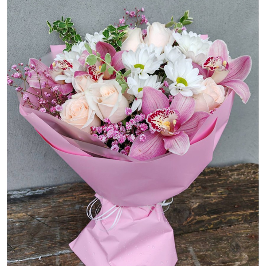 A charming bouquet combining the elegance of roses and orchids with the airiness of gypsophila and the cheerfulness of chamomile chrysanthemums. Accented with lush greenery, this floral arrangement radiates tenderness and sophistication. Perfect for expressing love, gratitude, or warm wishes on any occasion.