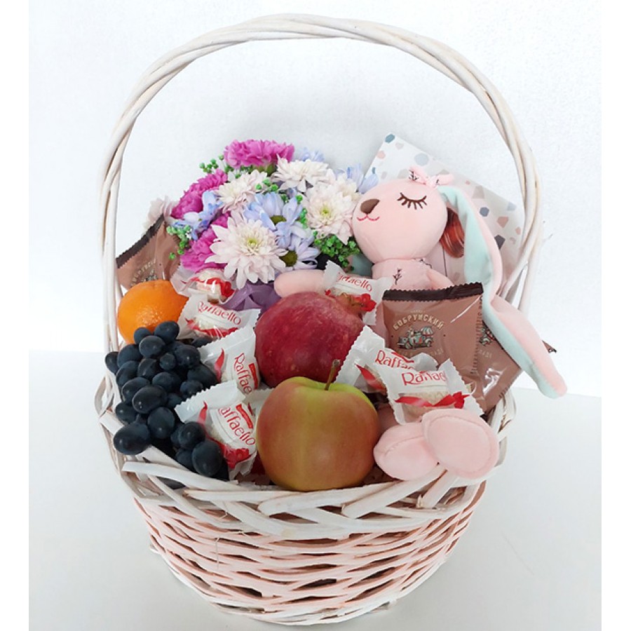 Deluxe - flower arrangement, bunny or bear toy, seasonal fruit 5 kg, Raffaello 150 g, chocolate covered marshmallows 150 g, wooden box