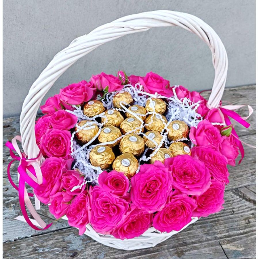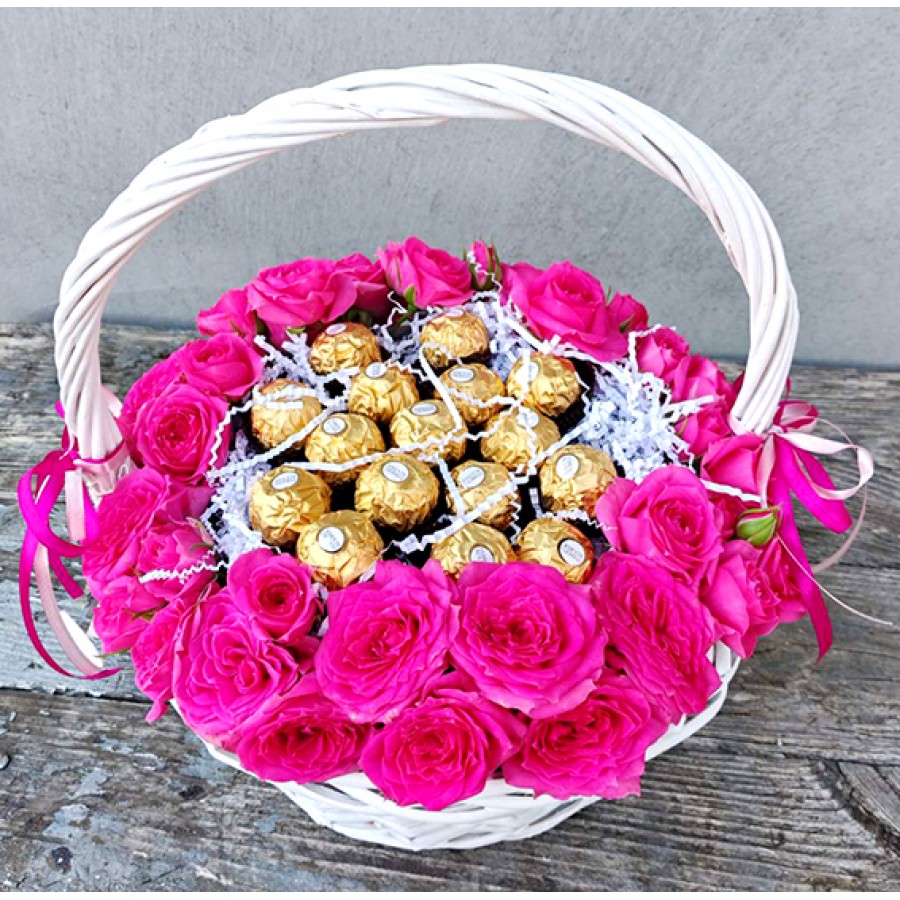 Surprise your loved ones with an elegant gift set from Flovers.by! This charming arrangement features vibrant roses, symbolizing love and appreciation, beautifully paired with the irresistible sweetness of Ferrero Rocher chocolates. Presented in a stylish basket, this gift set blends romance and indulgence into one perfect package. Ideal for birthdays, anniversaries, or special moments, it’s a heartfelt way to express your affection and make memories unforgettable.