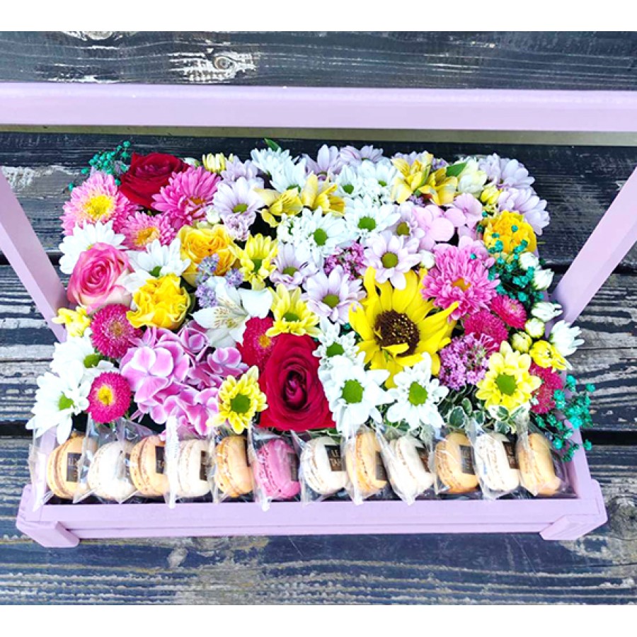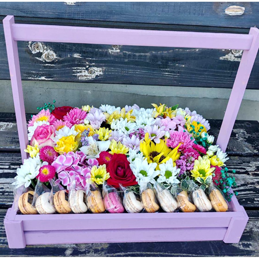 Wooden box, seasonal flowers and macaroon cookies.