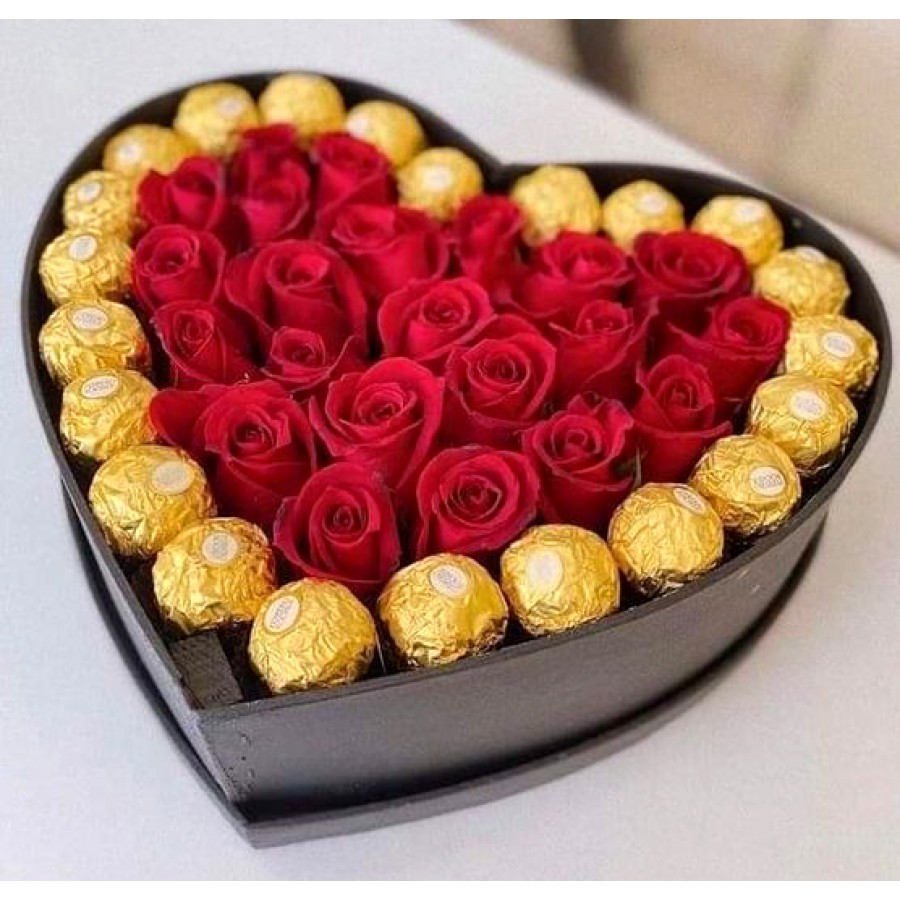 The "Heart of Roses and Ferrero Rocher" box is the perfect expression of love and elegance. A stunning arrangement of fresh roses forms a heart, paired with delightful Ferrero Rocher chocolates nestled within. This thoughtful combination of beauty and indulgence makes it an unforgettable gift, ideal for surprising loved ones on special occasions with a message of romance and sweetness.
