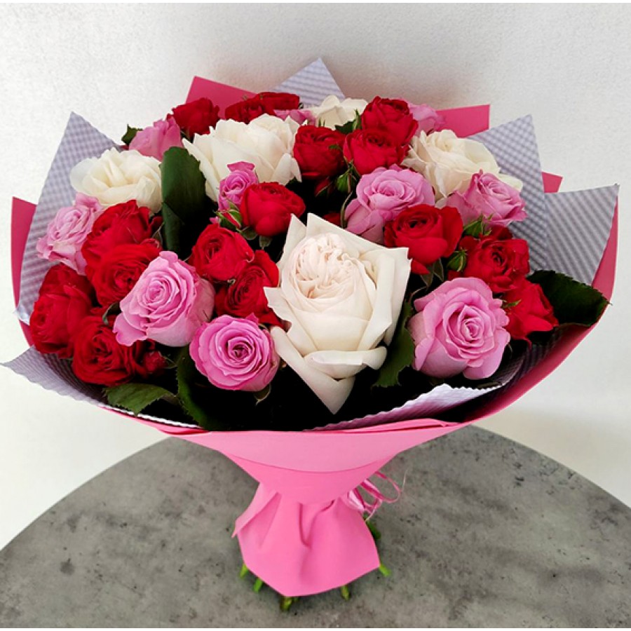 Very gentle, but at the same time bright bouquet of roses. Perfect for a young girl.